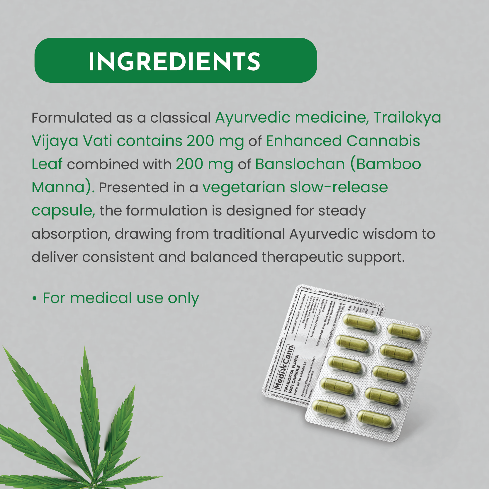 Trailokya Vijaya Vati is a doctor-prescribed Ayurvedic classical medicine formulated using Vijaya (Cannabis sativa leaf) and Bamboo (Banslochan), ingredients described in Ayurvedic texts that are hundreds of years old. In classical Ayurveda, medicines are designed not to suppress symptoms, but to restore balance to the body’s fundamental energies (doshas), especially Vata, which governs the nervous system, pain perception, movement, and sleep.